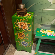 手工彩绘复古牡丹图三斗柜CD柜餐边床头柜花架地柜可定做实木家具